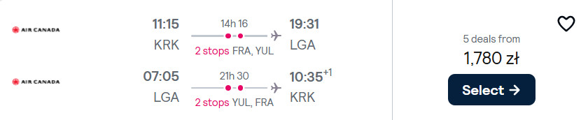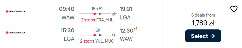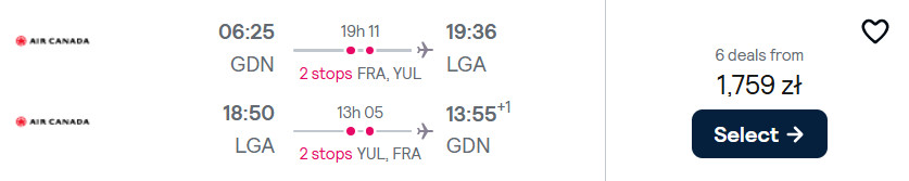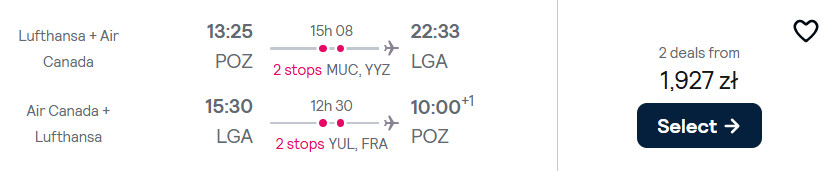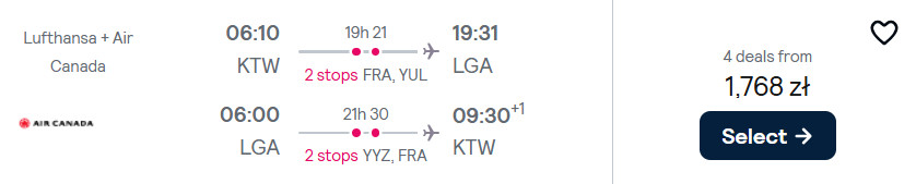Do Nowego Jorku (port lotniczy LaGuardia) polecisz w terminach pomiędzy 28 czerwca a 31 sierpnia, z Gdańsk, Katowic, Krakowa, Poznania, Warszawy lub Wrocławia. Na każdej trasie podróżować będziesz z przesiadkami we Frankfurcie oraz Montrealu.