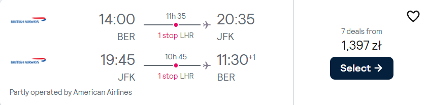 Do Nowego Jorku udasz się z portu lotniczego Berlin Brandenburg w marcu i kwietniu. W obie strony polecisz liniami z sojuszu One World (przeważnie American Airlines oraz British Airways) z przesiadkami na terenie Europy. Do USA bez dodatkowych kosztów wybierzesz się z bagażem podręcznym i przedmiotem osobistym.