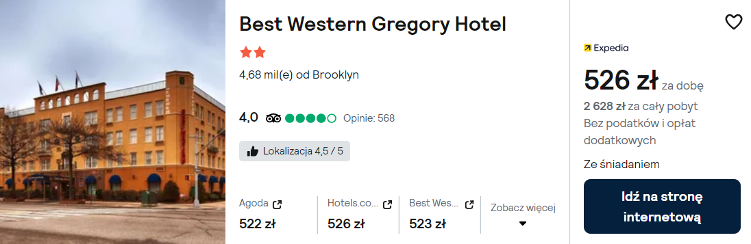 Na Brooklynie postaw na noclegi ze śniadaniami w hotelu Best Western Gregory, który znajduje się nieopodal stacji metra (86 St). Na wyposażeniu każdego pokoju jest: klimatyzacja z funkcją ogrzewania, telwizor LCD, zestaw do parzenia kawy i herbaty oraz kuchenka mikrofalowa.