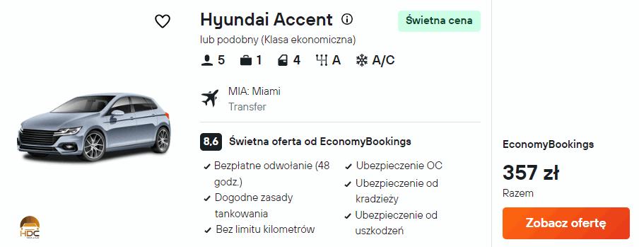 Samochód 357 PLN/pobyt