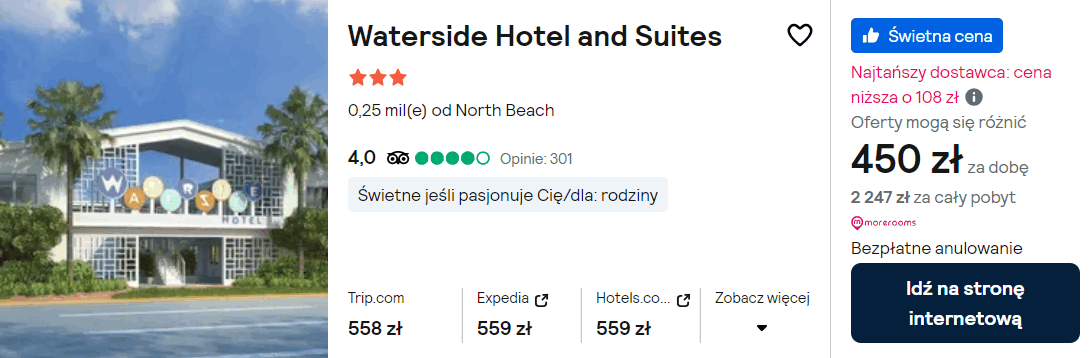 Natomiast w Miami zatrzymaj się w 3* Waterside Hotel and Suites, który od najbliższej plaży oddalony jest o 150 metrów. Na miejscu znajduje się odkryty basen. We wszystkich pomieszczeniach będziesz miał zapewniony dostęp do sieci WiFi.