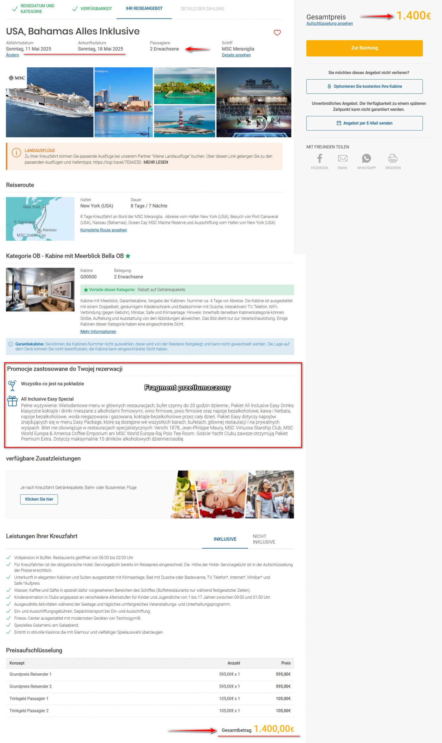 Rejs w terminie 11-18 maja statkiem MSC Meraviglia kosztować cię będzie 1400 EUR (ok. 6015 PLN/2 osoby – ok. 3008 PLN/osoba). W cenę wliczone jest zakwaterowanie w 2-osobowej kajucie z oknem, z łazienką, opłaty portowe, napiwki, wyżywienie, napoje do posiłków (woda, kawa, herbata, soki) oraz pakiet All Inclusive Easy.
