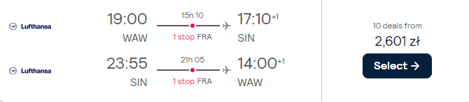 Aby uzyskać tytułową cenę, musisz dokonać dwóch oddzielnych rezerwacji. Najpierw na główny lot z Warszawy do Singapuru, realizowany w terminie 23 stycznia – 2(3) lutego. Czeka cię podróż na pokładzie samolotów linii lotniczej Lufthansa z bezpiecznymi, gwarantowanymi przez przewoźnika przesiadkami we Frankfurcie oraz Monachium.