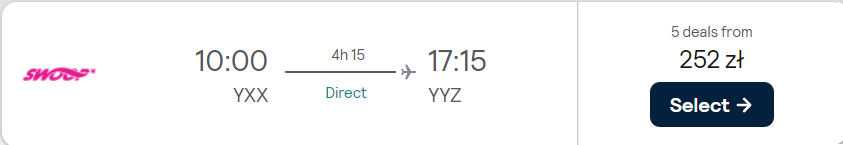 Przelot z Toronto do Calgary zaplanowany jest na 19 września. 23 września czeka cię lot do Vancouver. Natomiast do największego miasta Kanady wrócisz 27 września. Wszystkie odcinki pokonasz bezpośrednio na pokładach samolotów linii Flair Airlines, Lynx i Swoop. Całą wycieczkę bez dodatkowych kosztów odbędziesz z bagażem podręcznym oraz przedmiotem osobistym (mały plecak lub damska torebka).