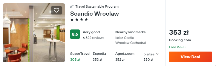 A może podróż do Wrocławia? W mieście krasnali wybierz bardzo dobrze oceniany 4* hotel znanej sieci Scandic.