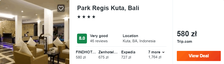 Na Bali zakwaterowani będziecie w 4* hotelu Park Regis Kuta, który od plaży o tej samej nazwie (Kuta) oddalony jest o nieco ponad 1 km. Z lotniska w okolice miejsca noclegowego dojedziecie taksówką za ok. 40 PLN.