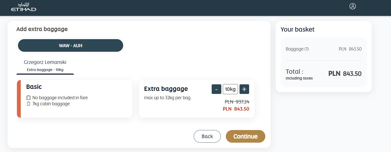 Etihad od dawna ma opinię linii, która potrafi iść pasażerom na rękę, jeśli chodzi o podróż z większym bagażem. Sprawdziliśmy to i… na pierwszy rzut oka wszystko się zgadza. Zmiana taryfy z Basic na Value, która pozwala zabrać ze sobą bagaż rejestrowany o wadze do 25 kg, to koszt zaledwie 100 zł! Podobnych cen próżno dziś szukać nawet w tanich liniach – jak Ryanair czy Wizz Air.