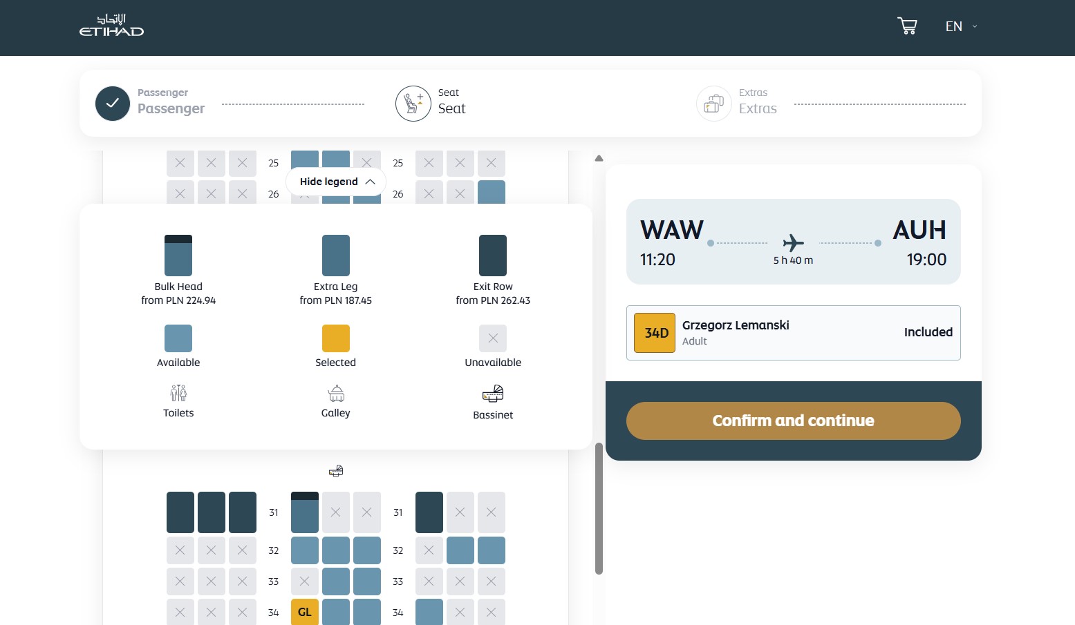 Potrzebujecie w podróży nieco więcej przestrzeni? Lecąc Etihadem będziecie zadowoleni. Ceny za wybór konkretnego miejsca są bowiem dość przystępne. Najtańsze są oczywiście fotele w tylnej części samolotu – za taki zapłacimy niecałe 80 zł. Miejsca w środku samolotu są nieco droższe, ale dalej nie jest to duży wydatek – z zależności od wybranego rzędu zapłacimy 93 – 101 zł.