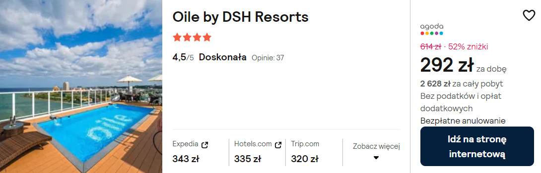 Na Okinawie polecam ci noclegi w 4* hotelu Oile by DSH Resorts, który znajduje się tuż przy plaży. Każdy pokój wyposażony jest w klimatyzację, telewizor LCD, lodówkę oraz czajnik elektryczny. W łazience jest prysznic, suszarka do włosów oraz podstawowe przybory toaletowe. Na miejscu zapewniony będziesz mieć dostęp do basenu, sieci WiFi oraz bezpłatnego parkingu.