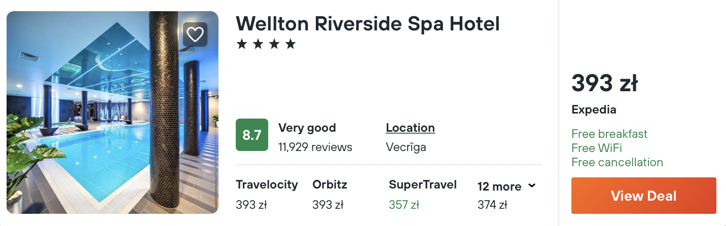 W Rydze proponuję wam pobyt w 4* hotelu Wellton Riverside Spa. W cenę zakwaterowania wliczono śniadania.