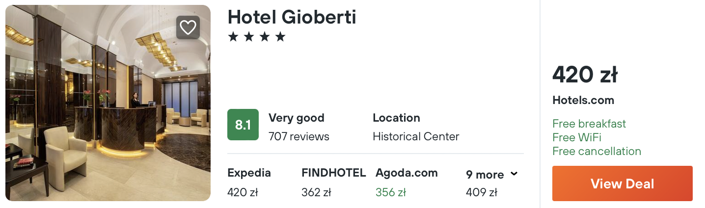 Natomiast w Rzymie wybierzcie noclegi w 4* hotelu Gioberti. Obiekt mieści się w samym centrum miasta. Otrzymacie również bezpłatne śniadania.
