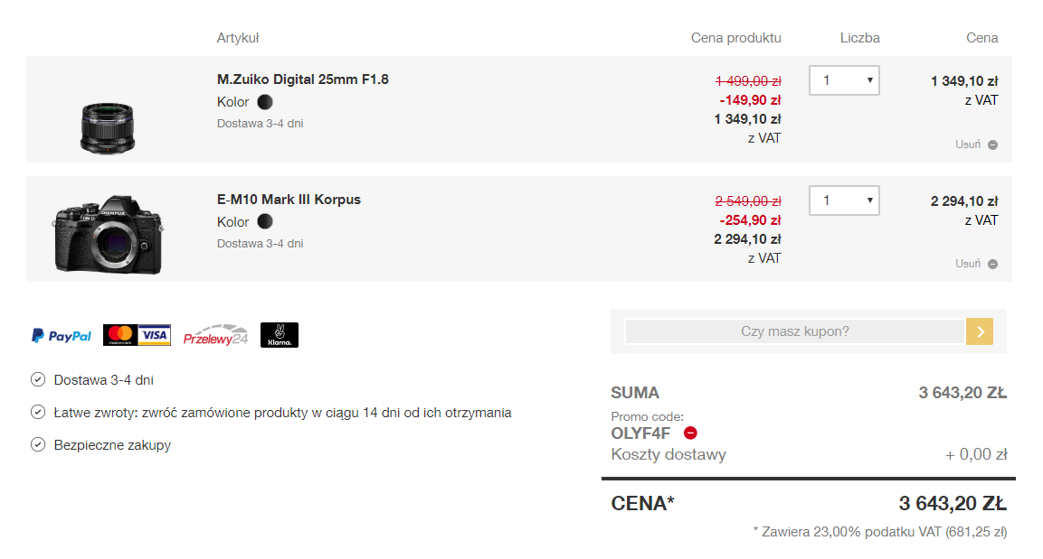 - Obiektyw M.Zuiko Digital ED 75mm 1:1:8 – rabat 600 zł