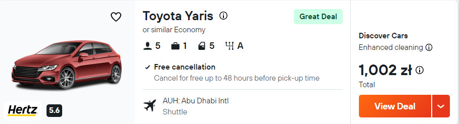 Zachęcam cię do wypożyczenia samochodu po przylocie do Abu Zabi. Posiadając do swojej dyspozycji auto, łatwiej i wygodniej będzie ci się poruszać po Zjednoczonych Emiratach Arabskich.