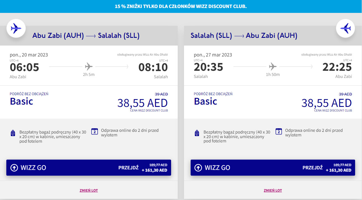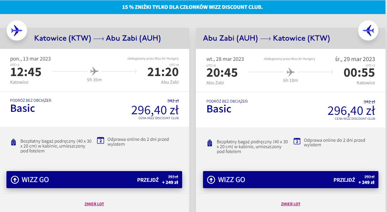 Wszystkie – 4 loty – są bezpośrednie i odbędziesz je na pokładach samolotów linii Wizz Air. Pamiętaj, że bilety w najniższej cenie dostępne są dla osób z Wizz Discount Club. Chętni na taką podróż bez WDC za loty zapłacą 894 PLN (szczegóły poniżej). Bez dodatkowych kosztów na wycieczkę zabrać możesz tylko mały bagaż podręczny.