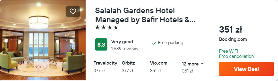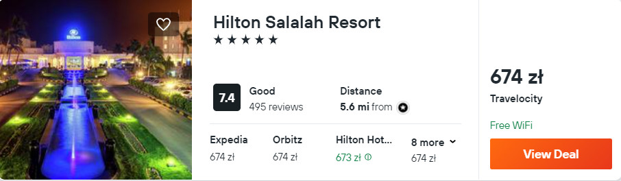 Jesteś w stanie wydać nieco więcej na noclegi? W takim razie rozważ ofertę pobytu w 5* hotelu Hilton Salalah Resort, który położony jest nad brzegiem Oceanu Indyjskiego. Na miejscu znajduje się prywatna plaża, dwa baseny, brodzik dla najmłodszych, centrum fitness, sauna sucha oraz łaźnia parowa.