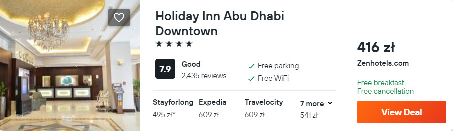 W Abu Zabi rekomenduję ci noclegi z codziennymi śniadaniami w 4* hotelu Holiday Inn Abu Dhabi Downtown. Znajduje się on w biznesowej części miasta, w odległości 15 minut spokojnego spaceru od najbliższej plaży.
