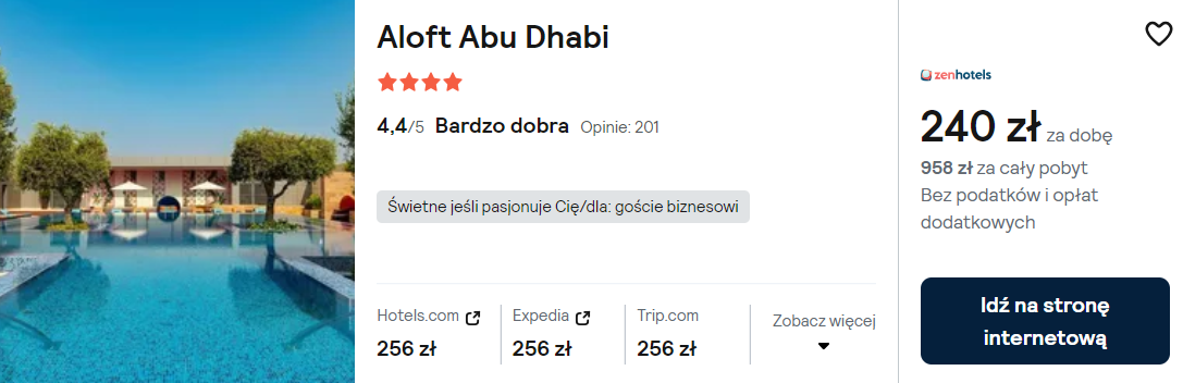 Natomiast w Abu Zabi polecam ci zakwaterowanie w 4* hotelu Aloft Abu Dhabi z odkrytym basenem bez krawędzi. Wszystkie pokoje są klimatyzowane i wyposażone w telewizor LCD oraz lodówkę. W łazience jest prysznic i suszarka do włosów.