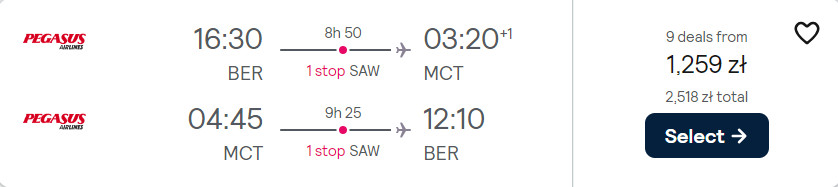 Do Maskatu udasz się z berlińskiego portu lotniczego im. Willy’ego Brandta w terminie 30 kwietnia – 7 maja. W obie strony polecisz na pokładach samolotów linii Pegasus Airlines z przesiadkami w Stambule. Bez dodatkowych kosztów zabrać ze sobą możesz bagaż podręczny.