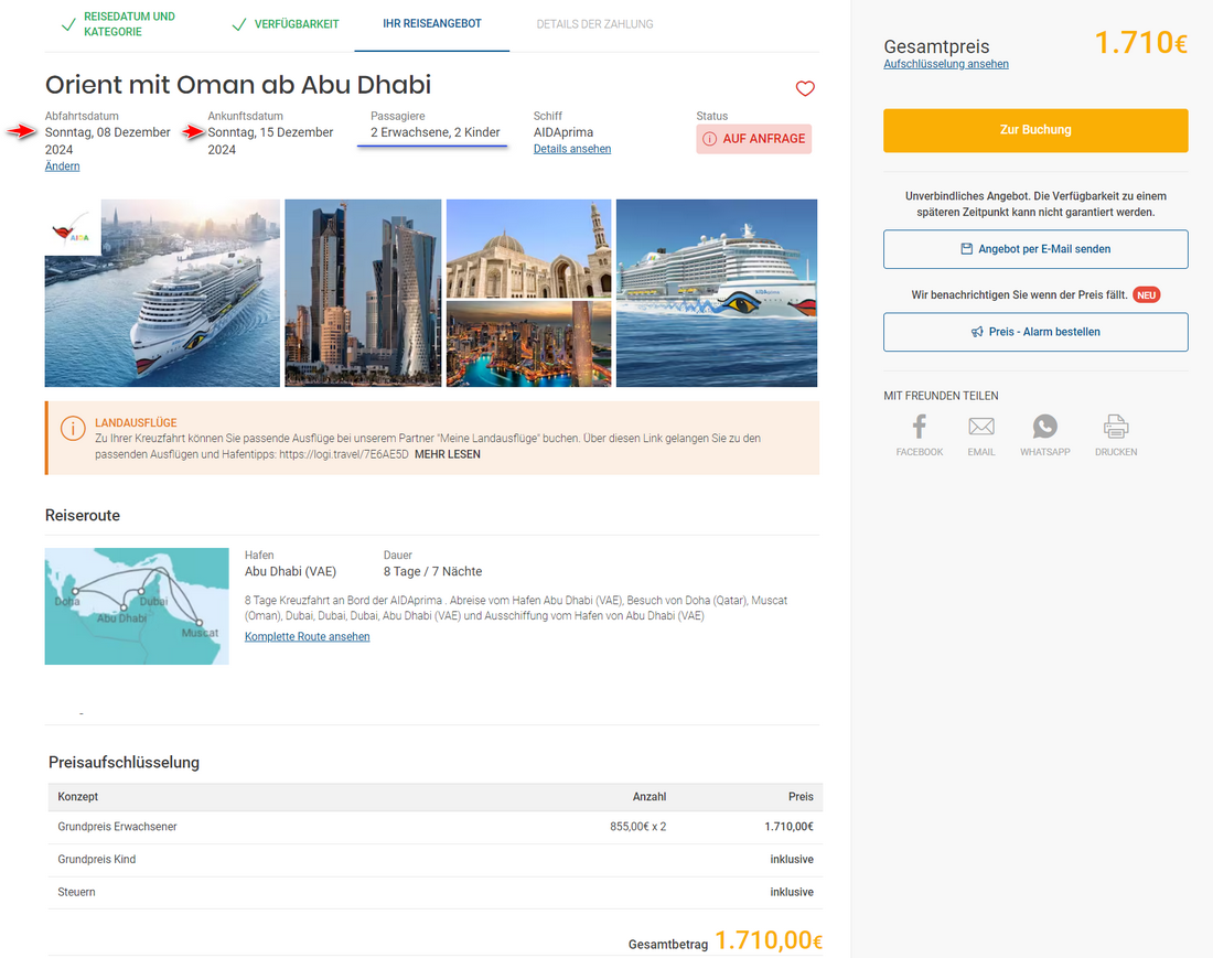 Dzieci do 15-ego roku życia nie płacą nic za rejs! Należy opłacić im jedynie przeloty w obie strony 🙂 . W kabinie z rodzicami może podróżować maksymalnie dwójka dzieci. W takim przypadku rejs (w kajucie z balkonem) dla trzyosobowej rodziny to wydatek rzędu 3468 PLN/osoba (loty+rejs). Natomiast jeżeli na taki rejs wybierz się rodzina czteroosobowa (2+2), to każdy zapłaci po 2852 PLN (bilety na samolot + rejs)! PS poniżej przykładowa rezerwacja rejsu dla czterech osób.