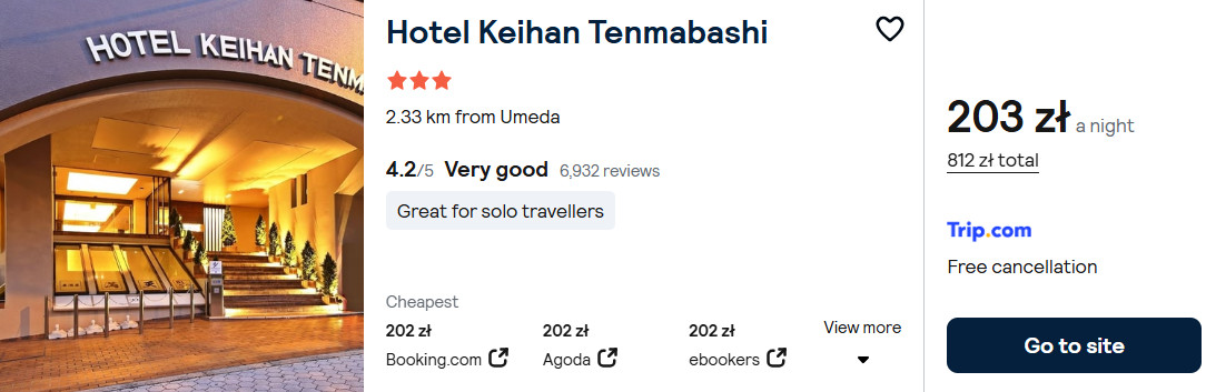 Hotel Keihan Tenmabashi, mieści się tuż przy stacji metra i kolei, zapewnia szybkie połączenia po Osace. W okolicy czekają Zamek Osaka, restauracje, sklepy i centrum handlowe.