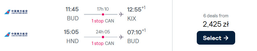 Do Japonii (Osaka+Tokio) polecisz z Budapesztu. Sprawdź, jak szybko i wygodnie dojechać z Polski na lotnisko w stolicy Węgier. W obie strony podróżować będziesz linią China Southern z przesiadkami w Kantonie.