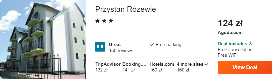 Dowiedzcie się więcej o tym hoteluDruga propozycja to Przystań Rozewie na obrzeżach Jastrzębiej Góry. Pokoje w tym obiekcie zostały urządzone w nowoczesnym stylu, a do waszej dyspozycji będzie m.in. wspólna, w pełni wyposażona kuchnia, a także sprzęt do grillowania na świeżym powietrzu.