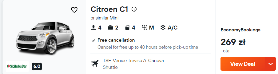 Za loty w obie strony i wynajem samochodu zapłacisz 365 PLN, przy 2 osobach podróżujących.