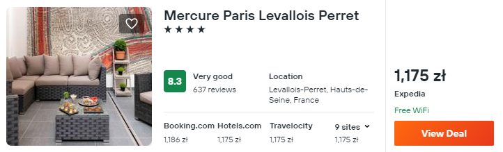 Wybrałem zakwaterowanie w bardzo dobrze ocenianym 4* hotelu znanej sieci Mercure Paris Levallois Perret. Będzie to przyjemne miejsce na wypoczynek oraz doskonała baza wypadowa – obiekt znajduje się niedaleko stacji metra.