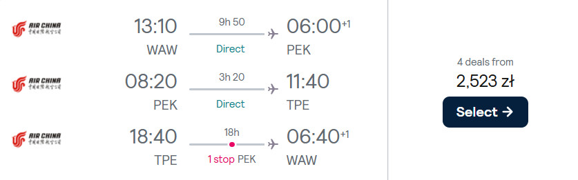 Na początek czeka cię bezpośredni lot (21 marca) z Warszawy do Pekinu. Ze stolicy Chin na Tajwan polecisz 26 marca. Natomiast w drogę powrotną z Tajpej do stolicy Polski wyruszysz 1 kwietnia. W cenę biletu wliczony jest bagaż rejestrowany, podręczny oraz przedmiot osobisty.