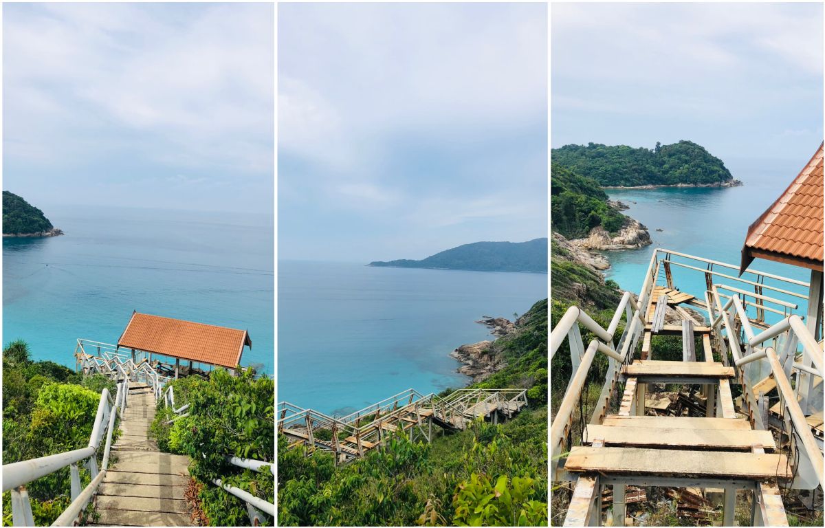Około 20 minutowy trekking przez dżunglę wynagrodzony zostanie wspaniałym widokiem. Na jego szczycie znajduje się niewielka elektrownia wiatrowa, a w jej bezpośrednim pobliżu malowniczo położony punkt widokowy na drugą część wyspy. Do plaży położonej na dole prowadzą schody, które jednak poważnie ucierpiały w czasie monsunu. Szlak pozostaje oficjalnie zamknięty, a stopnie prowadzące na dół przypominają szeroki uśmiech z poważnymi brakami w uzębieniu, zatem to droga wyłącznie dla osób szukających guza. Również miejscowi operatorzy wodnych taksówek odradzali wycieczkę do laguny na dole, co stanowiło dla mnie wystarczające potwierdzenie, że tym razem nie warto pchać się tam na siłę.