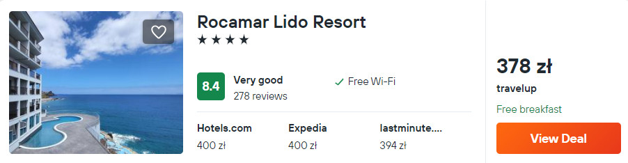 Niewiele więcej zapłacisz za pobyt w 4* hotelu Rocamar Lido Resort na Maderze. Każdy pokój został wyposażony w klimatyzację z funkcją ogrzewania oraz telewizor LCD. W łazience jest wanna z prysznicem, suszarka do włosów oraz podstawowe przybory toaletowe.