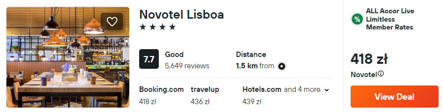 Natomiast w stolicy Portugalii proponuję ci noclegi w 4* hotelu Novotel, który znajduje się w sąsiedztwie ogrodu zoologicznego. Każdy pokój wyposażony jest w klimatyzację, telewizor LCD, minibar oraz czajnik elektryczny. W łazience jest prysznic, a dla gości przygotowano podstawowe przybory toaletowe.