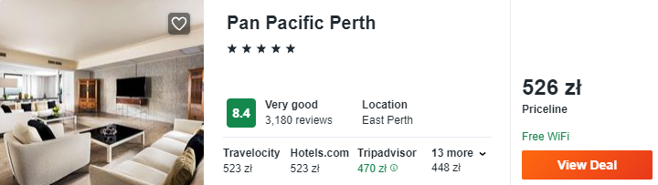 W Perth rekomenduję wam zakwaterowanie w 5* hotelu Pan Pacific. To rewelacyjnie oceniany obiekt, który znajduje się w samym centrum miasta. Na miejscu znajdziecie basen zewnętrzny i siłownię.