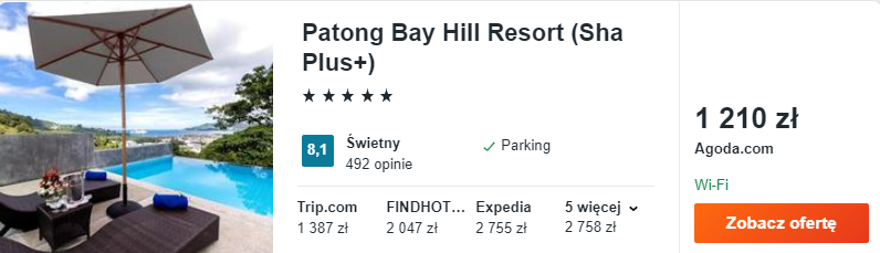 Na Phuket wybrałem dla was luksusowy 5* hotel Patong Bay Hill Resort. Do waszej dyspozycji będzie odkryty basen z widokiem na okolicę, eleganckie pokoje, bar, restauracja oraz strefa spa.