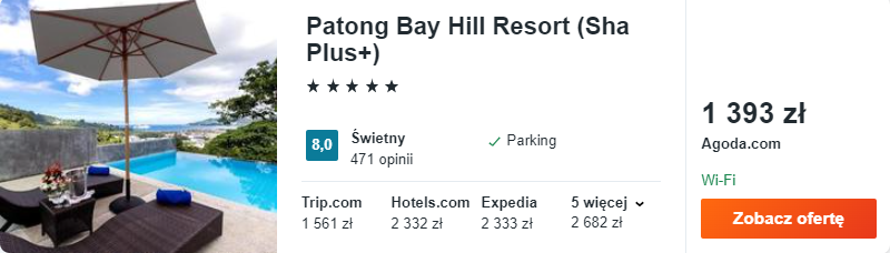 Zatrzymajcie się w bardzo dobrym 5* hotelu Patong Bay Hill Resort. Do waszej dyspozycji będą nowocześnie urządzone, przestronne wnętrza, basen na dachu oraz restauracja.