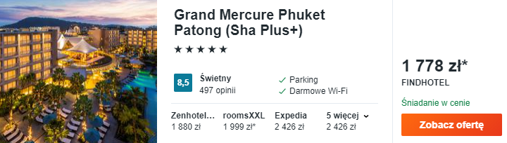 Jako miejsce zakwaterowania wybrałem dla was luksusowy, 5* hotel Grand Mercure Phuket Patong. Czekają tam na gości elegancko urządzone pokoje, świetna restauracja, odkryty basen oraz obsługa na najwyższym poziomie.
