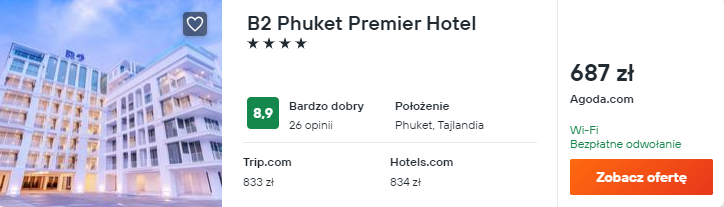Wybrałem dla was noclegi w bardzo dobrze ocenianym 4* B2 Phuket Premier Hotel. Do waszej dyspozycji będą nowoczesne, komfortowe pokoje oraz odkryty basen.