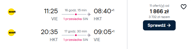 Do Azji polecisz w terminie 14(15) – 22(23) maja. Czeka cię podróż z Wiednia na Phuket linią Scoot. Po drodze przesiądziesz się w Singapurze.