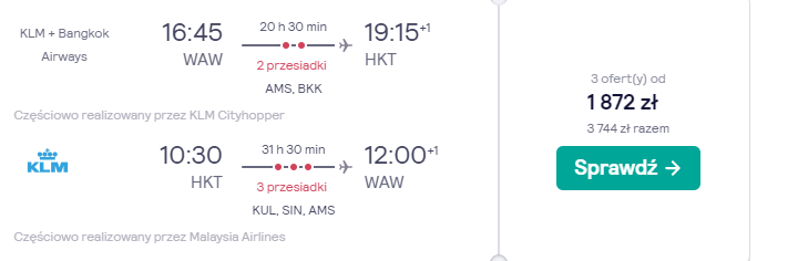 W podróż do Tajlandii udacie się jeszcze w tym sezonie, w terminie 7(8) – 15 marca. Czekają was loty z warszawskiego lotniska im. Fryderyka Chopina, realizowane na pokładzie samolotów linii lotniczych KLM oraz Malaysia Airlines z bezpiecznymi, gwarantowanymi przez przewoźników przesiadkami w Amsterdamie, Bangkoku oraz Kuala Lumpur.