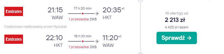 Na wycieczkę na Phuket polecicie w marcu, w terminie 8-21.03. Czeka was podróż z warszawskiego lotniska im. Fryderyka Chopina, realizowana na pokładzie samolotu linii lotniczej Emirates. Po drodze zaplanowano bezpieczne, gwarantowane przez przewoźnika przesiadki w Dubaju.