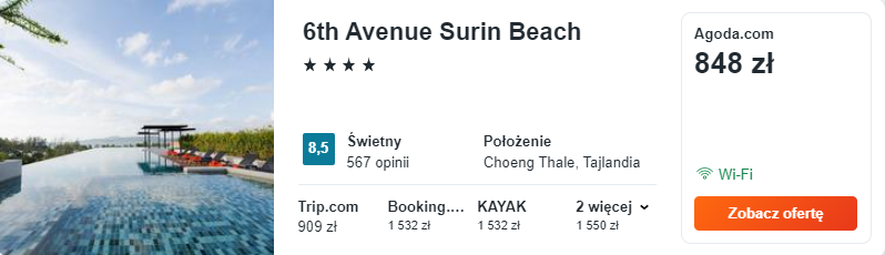 Rekomenduję postawić na zakwaterowanie w bardzo dobrze ocenianym 4* hotelu 6th Avenue Surin Beach. Do waszej dyspozycji będzie tam m.in. basen na dachu z panoramicznym widokiem na okolicę!