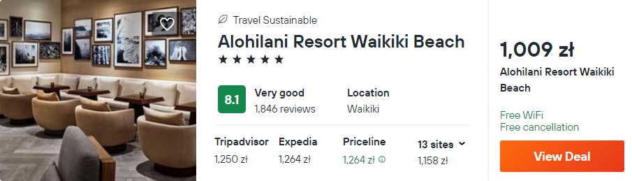Na Hawajach wybrałam dla ciebie noclegi w 5* hotelu Alohilani Resort Waikiki Beach. Na miejscu znajdziesz komfortowo urządzone pokoje z widokiem na ocean. Skorzystasz również z basenu, strefy spa i ogrodu.