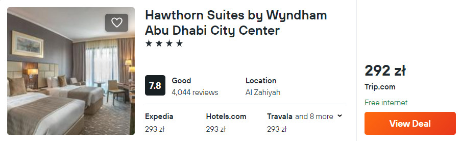 W Abu Zabi polecam ci noclegi w 4* hotelu Hawthorn Suites by Wyndham Abu Dhabi City Center. Każdy pokój jest wyposażony w klimatyzację, minibar, telewizor LCD oraz czajnik elektryczny. W łazience jest prysznic, suszarka do włosów oraz podstawowe przybory toaletowe.