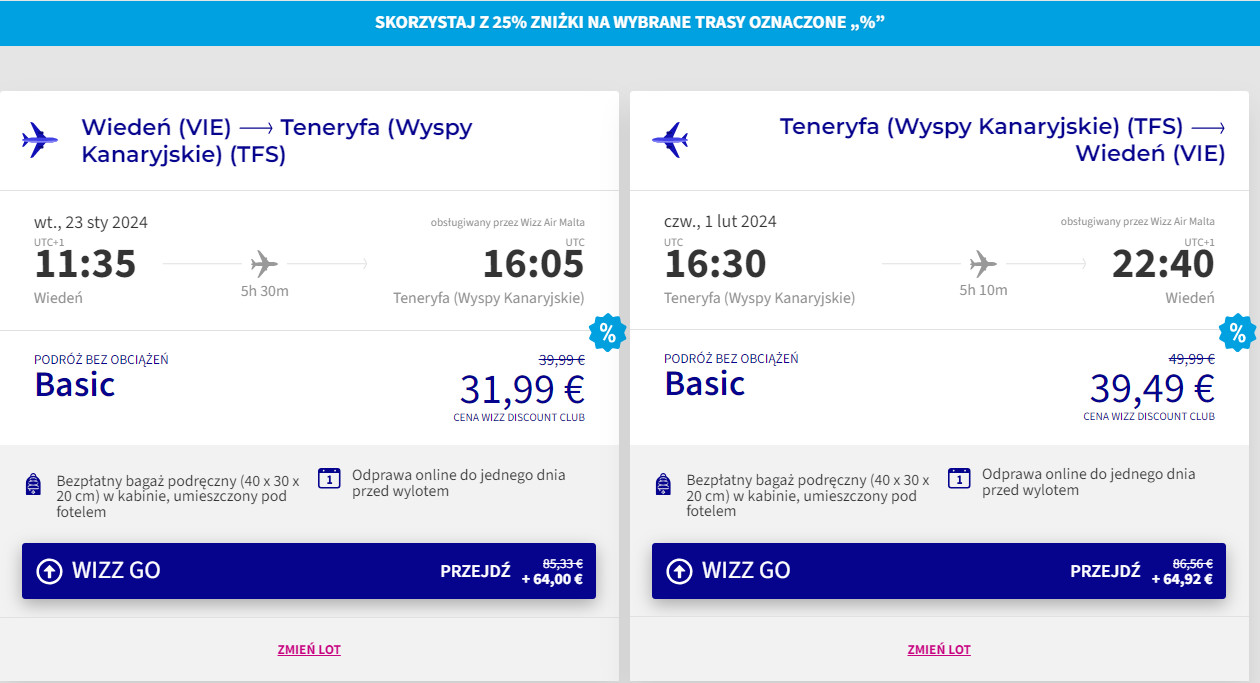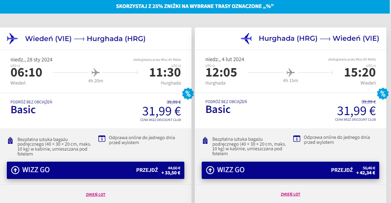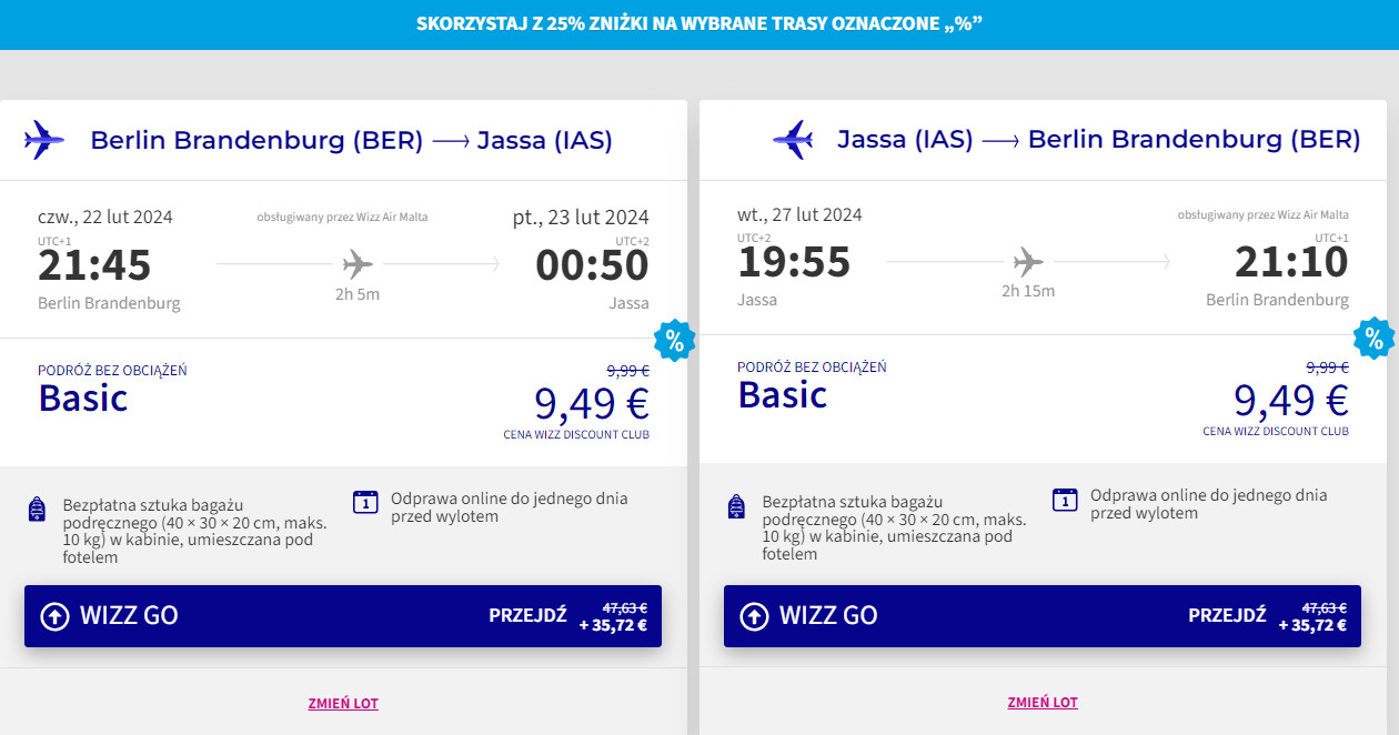 Na każdej trasie polecisz bezpośrednio na pokładzie samolotu linii Wizz Air z wliczonym małym bagażem podręcznym. Bilety w najniższej cenie dostępne są dla członków Wizz Discount Club. Chętni na loty bez WDC zapłacą więcej.