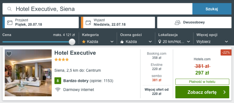 Jako formę zakwaterowania proponuję 4* obiekt położony w Sienie. W cenie wliczone są śniadania. Klimatyzowane pokoje wyposażone są w telewizor LCD z dostępem do kanałów telewizji satelitarnej. Hotel położony jest w spokojnej okolicy obok dużego parku i zapewnia bezpłatny parking oraz doskonałe połączenia autobusowe z zabytkowym centrum Sieny (2 km).
