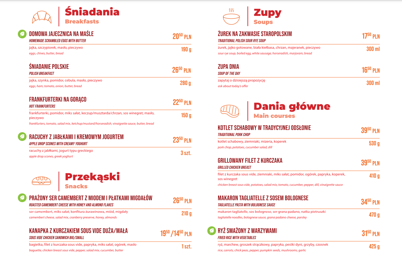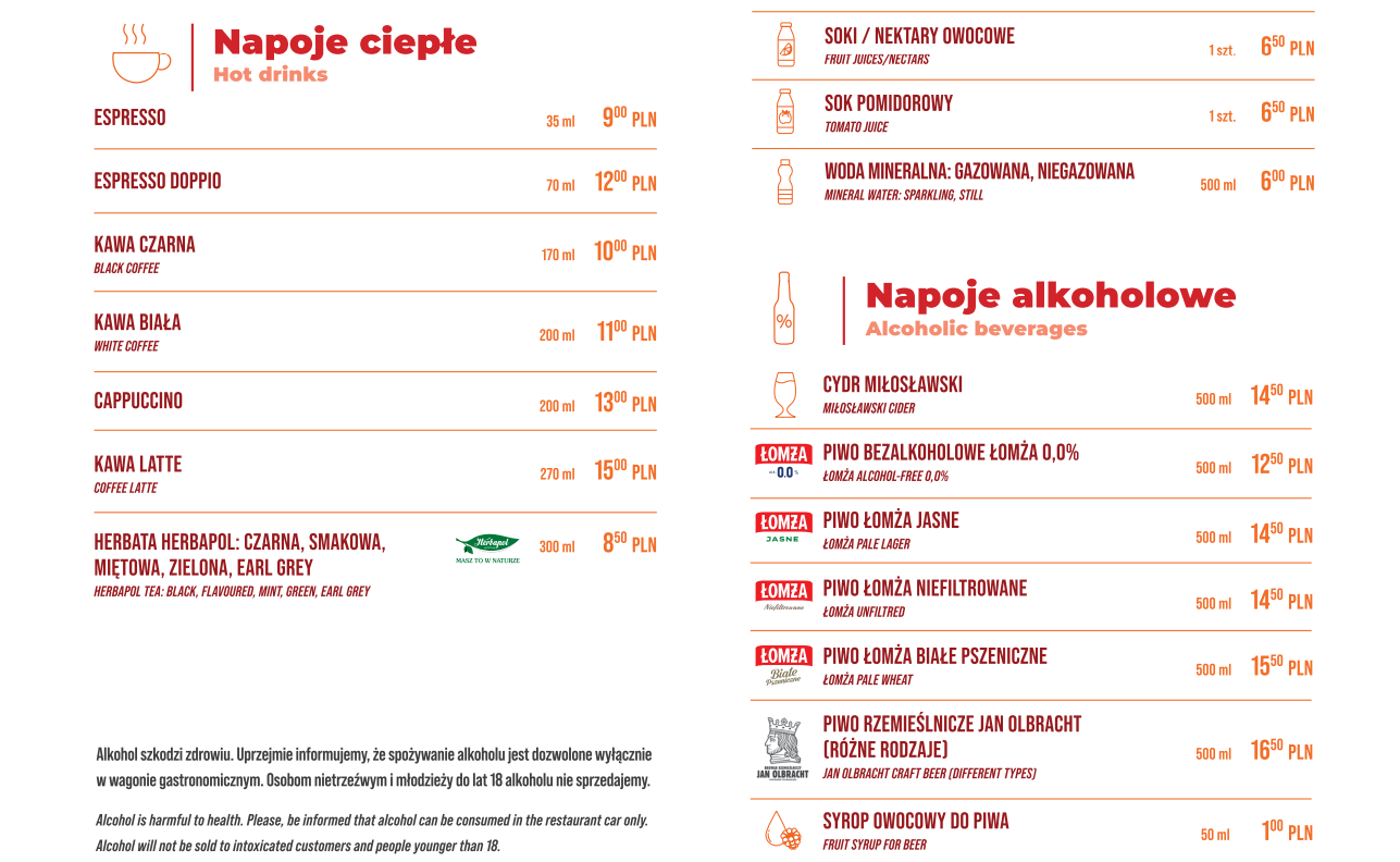 W ofercie przeznaczonej dla pasażerów pociągów Intercity droższe stały się także zupa dnia (z 14,50 zł na 16,50 zł), śniadanie polskie (z 24,50 zł na 26,50 zł) czy racuchu z jabłkami i jogurtem (z 22,50 zł na 23,50 zł). Do tego z listy deserów zniknęła szarlotka i pozostało jedynie ciasto dnia za 14,50 zł (wcześniej 14 zł). Bez zmian pozostały ceny gazowanych napojów, soków i kawy, ale za to podrożały jasne (z 13,90 zł na 14,50 zł) i rzemieślnicze piwo (z 15,80 zł na 16,50 zł).