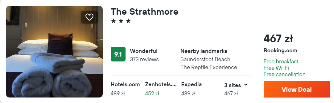 W miejscowości Tenby wybrałem dla ciebie 3* hotel The Strathmore. W cenę noclegów wliczono codzienne śniadania.