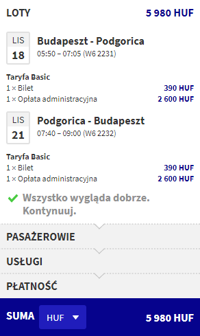Wizz Air | Budapeszt 16:10 – Podgorica 17:35 | 2990 HUF (ok. 42 PLN) (WDC) | 18 listopada