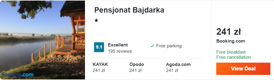 Dowiedzcie się więcej o tym hoteluNad rzeką Narew położony jest ostatni obiekt, na przygotowanej przeze mnie liście – Pensjonat Bajdarka. W cenę noclegów wliczone są codzienne śniadania, dostęp do sieci WiFi oraz możliwość korzystania z bezpłatnego parkingu. Odległość od centrum Białegostoku wynosi niespełna 30 km.