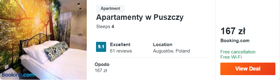 Dowiedzcie się więcej o tym hoteluW spokojnej okolicy Augustowa mam dla was ofertę pobytu w dobrze brzmiących apartamentach w Puszczy. Obiekt ten znajduje się w bliskim sąsiedztwie plaży miejskiej oraz jeziora Necko. Każdy z apartamentów wyposażony został w aneks kuchenny oraz telewizor LCD.